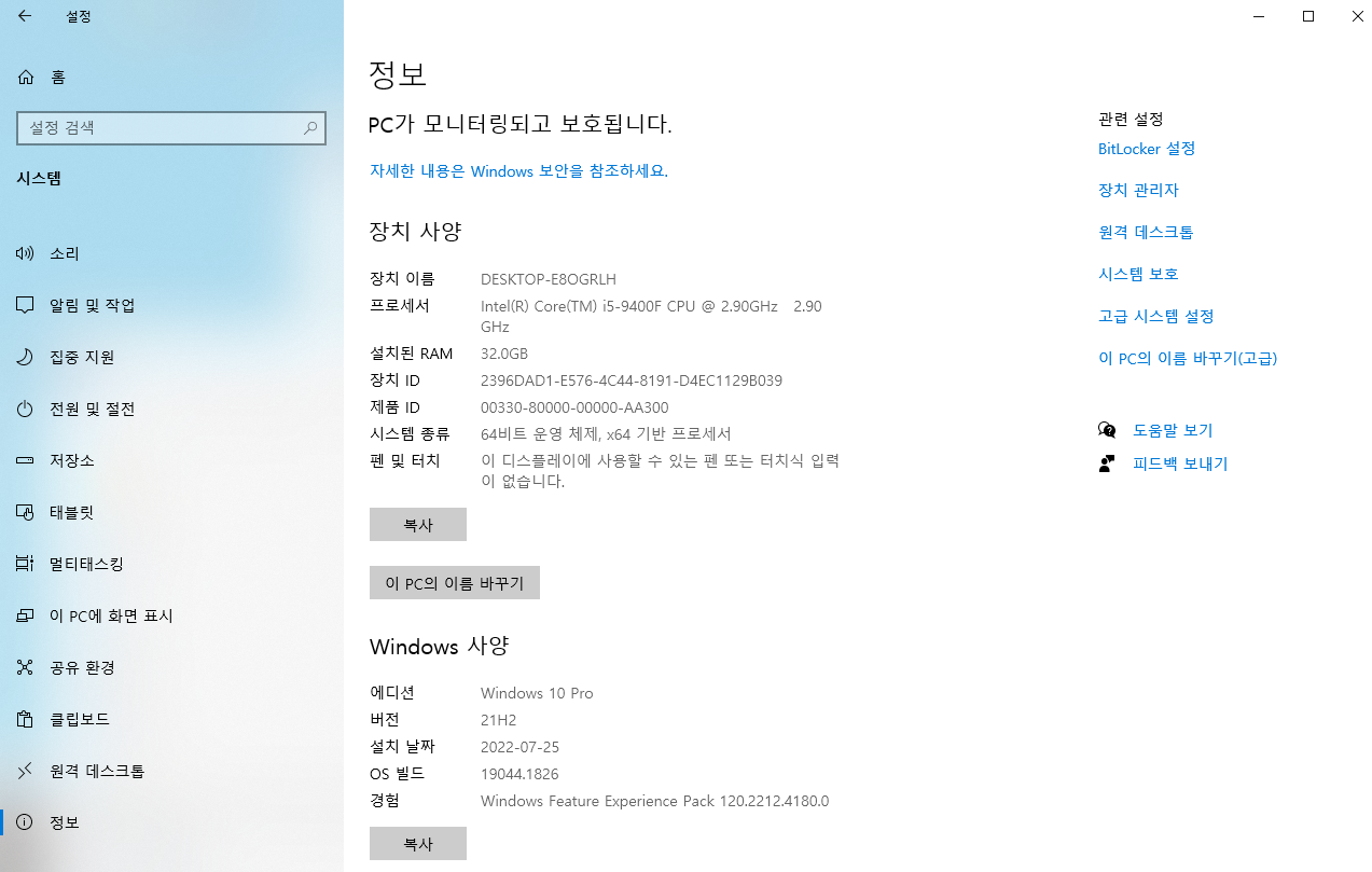 내 컴퓨터의 사양 확인은 내 컴퓨터 설정 에서 확인 가능합니다.
