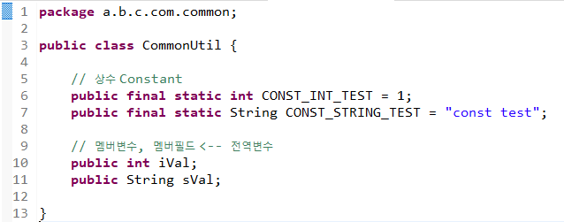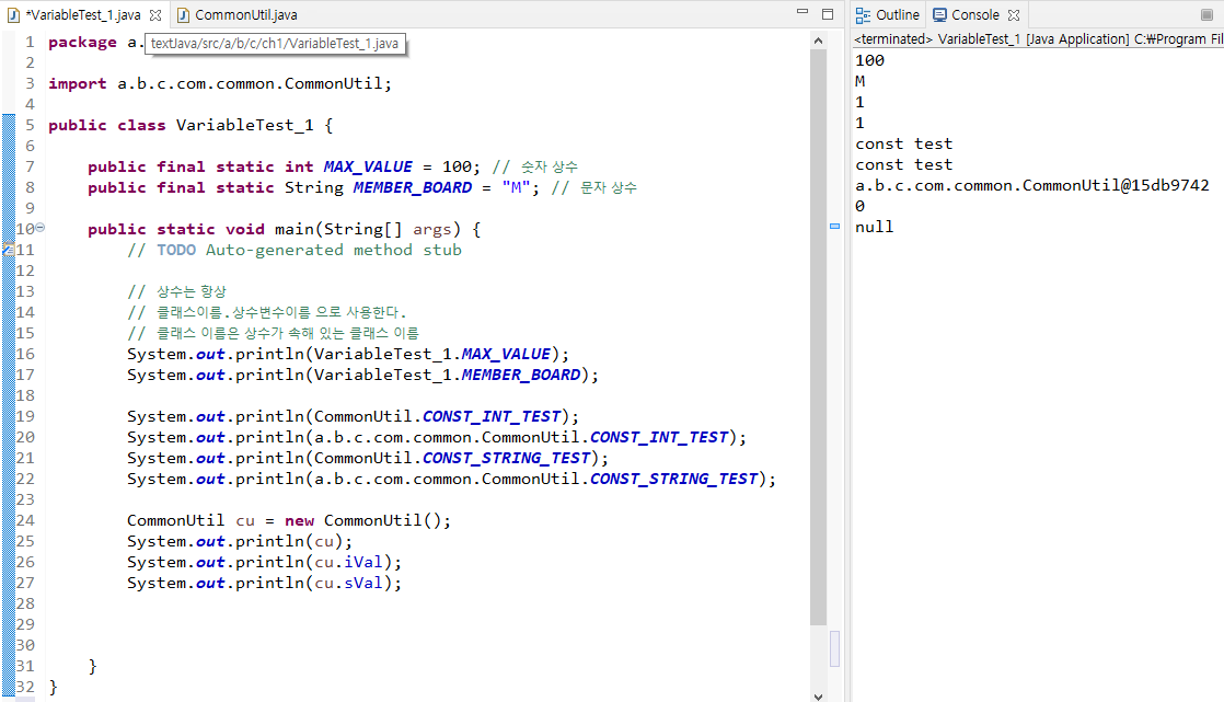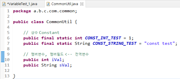 상수 호출하기 예제) CommonUtil의 상수를 VariableTest_1 클래스에 가져온다.