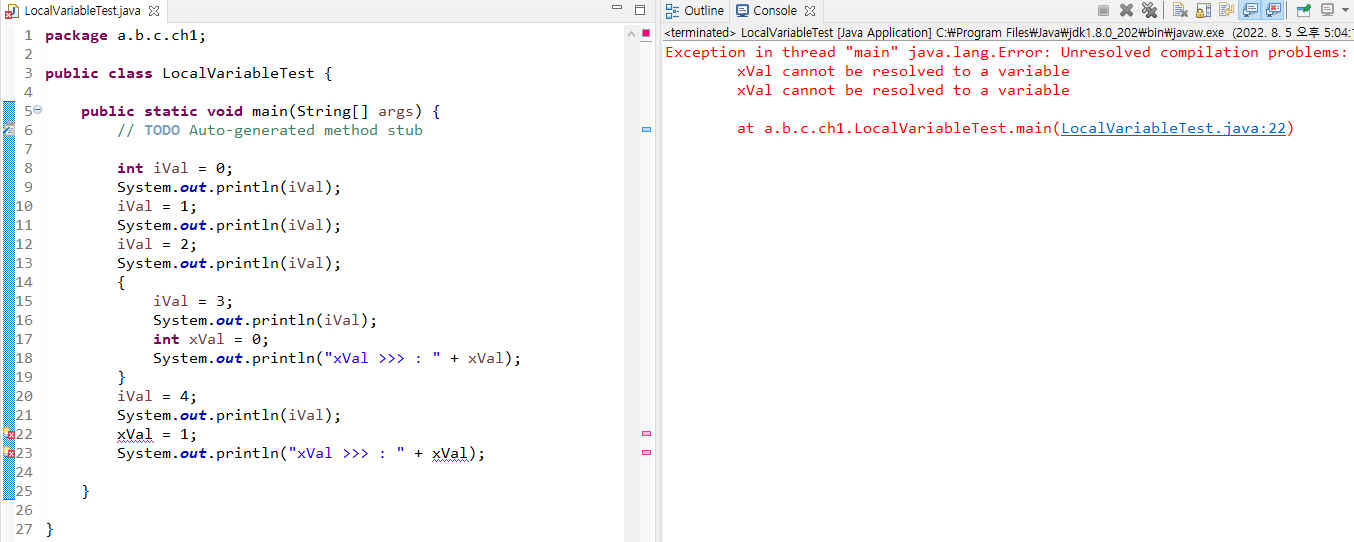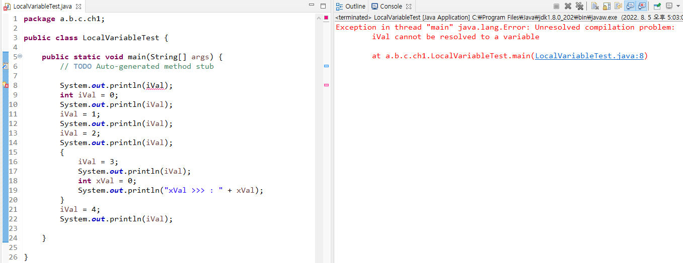 출력값을 먼저 입력했을때 ) 오류나는 이유 : 자바는 인터프리터 방식이라 윗줄부터 읽기때문에 선언 먼저 해야함.