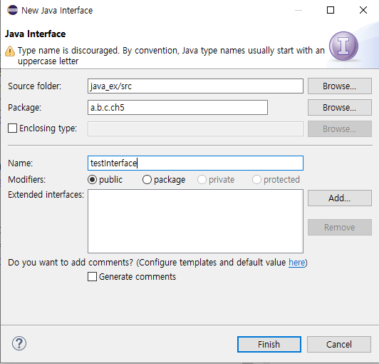 패키지에다 마우스 우클릭 - New - Interface - 인터페이스 이름 쓰고 Finish 클릭