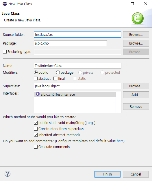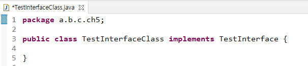 패키지에서 마우스 우클릭 - new - class - interfaces - add클릭 - Choose interfaces 에 검색하면 생성한 인터페이스가 뜸 - ok클릭
