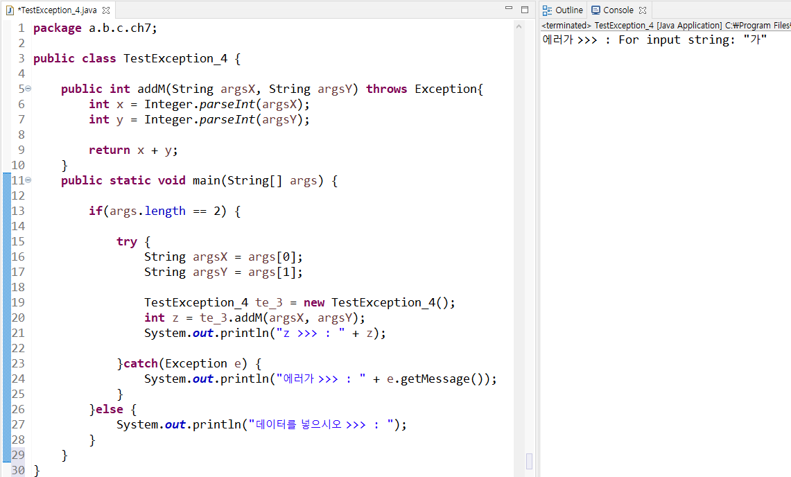 - 예외를 처리할 때는 throw를 제일 먼저 쓰고 맨 마지막에 처리하는 애(보통 main) 한테 try - catch 를 넣어주면 됨