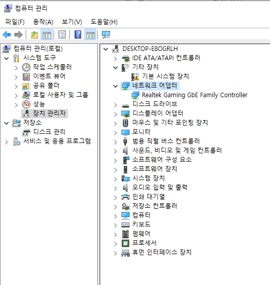참고) 내PC - 관리 - 시스템도구 - 장치관리자 - 네트워크 어댑터에 있는 Realtek Gaming GbE Family Controller 가 이더넷카드이다.
