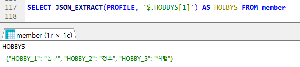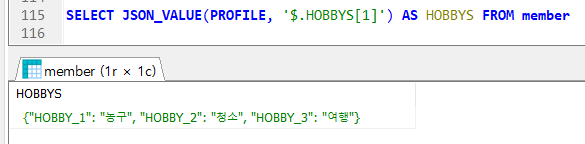 MEMBER 테이블에서 JSON 데이터 PROFILE 객체 중 배열 조회